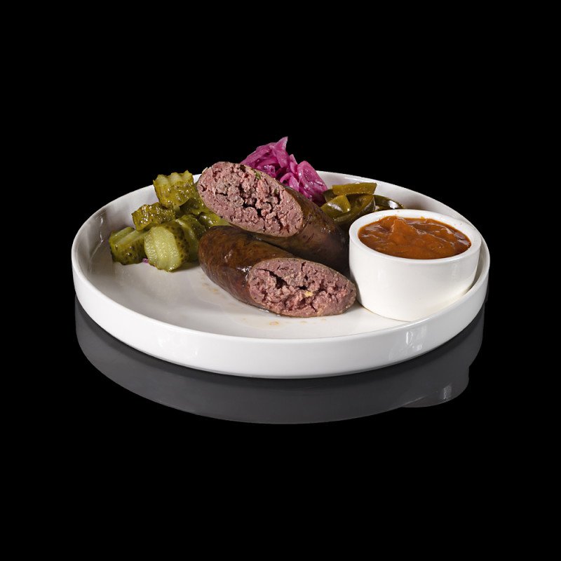 Говяжьи колбаски, приготовленные в техасском смокере. Подается с маринованными огурцами, луком, халапеньо и соусом барбекю.