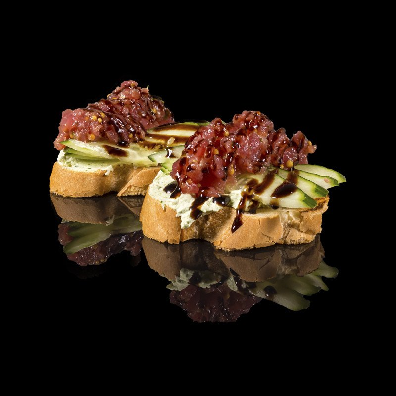 Подсушенный багет, мусс песто, руккола, свежий огурец, тунец, бальзамический соус, лайм.