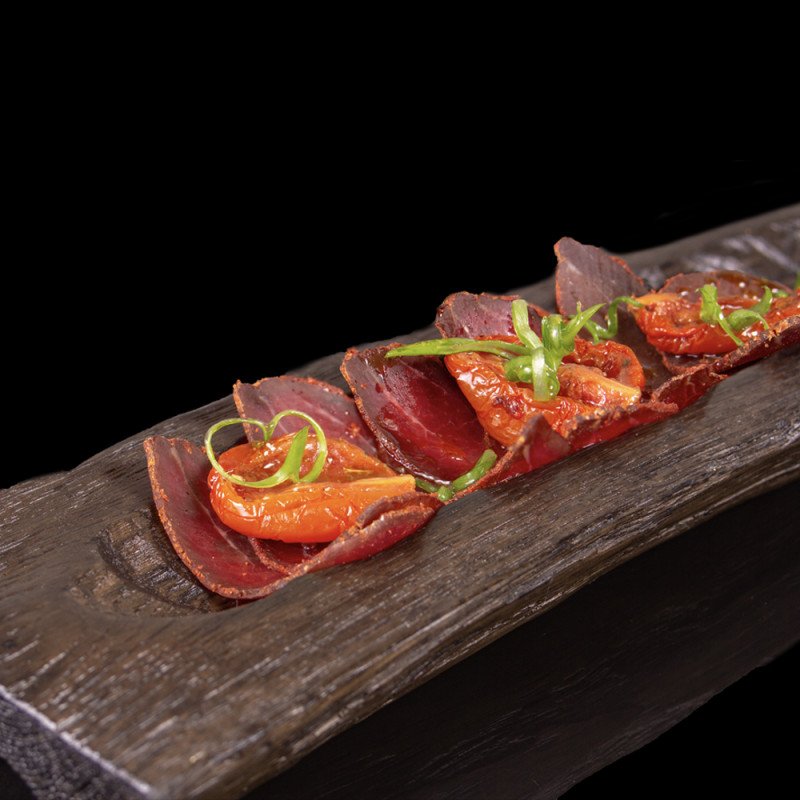 Вяленая говяжья вырезка в острых специях, украшенная вялеными томатами.