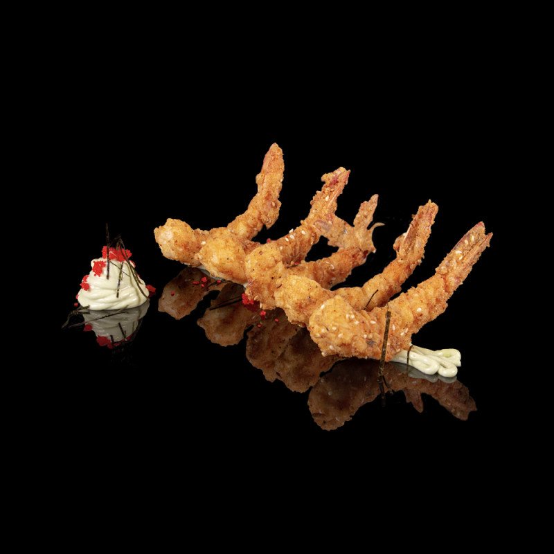 Тигровые креветки, обжаренные в кляре. Украшаются икрой тобико и подаются с соусом сладкий васаби