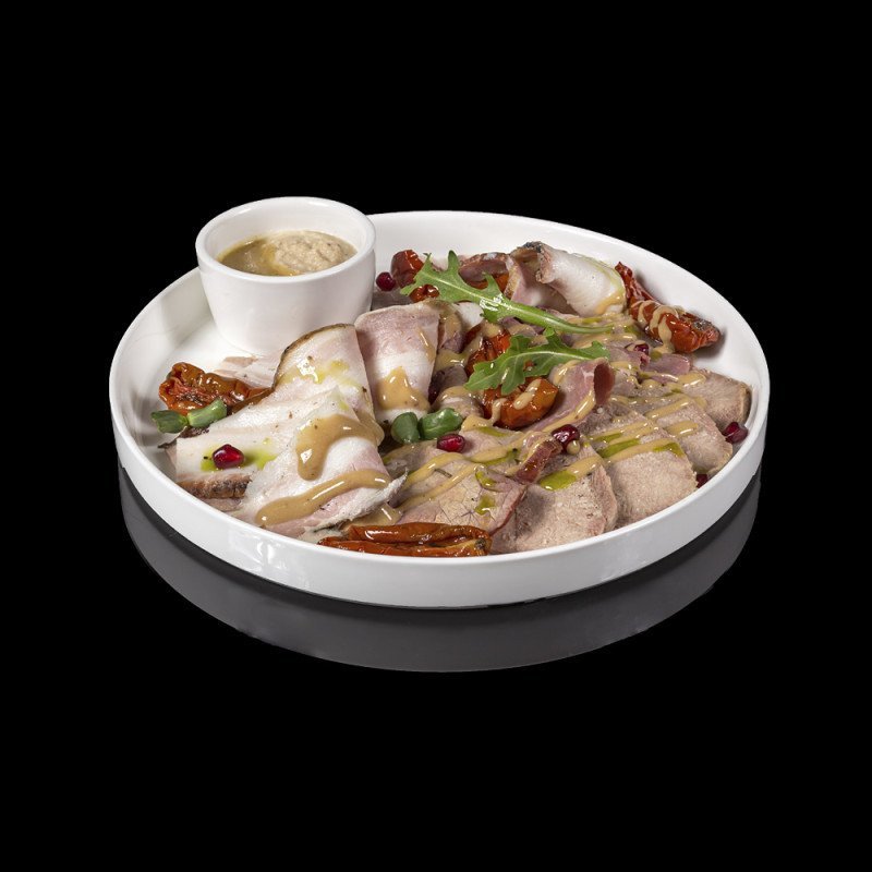 Бекон, копченный в смокере, ростбиф, отварной язык. Подается с горчицей и хреном, украшается вялеными томатами и гранатом