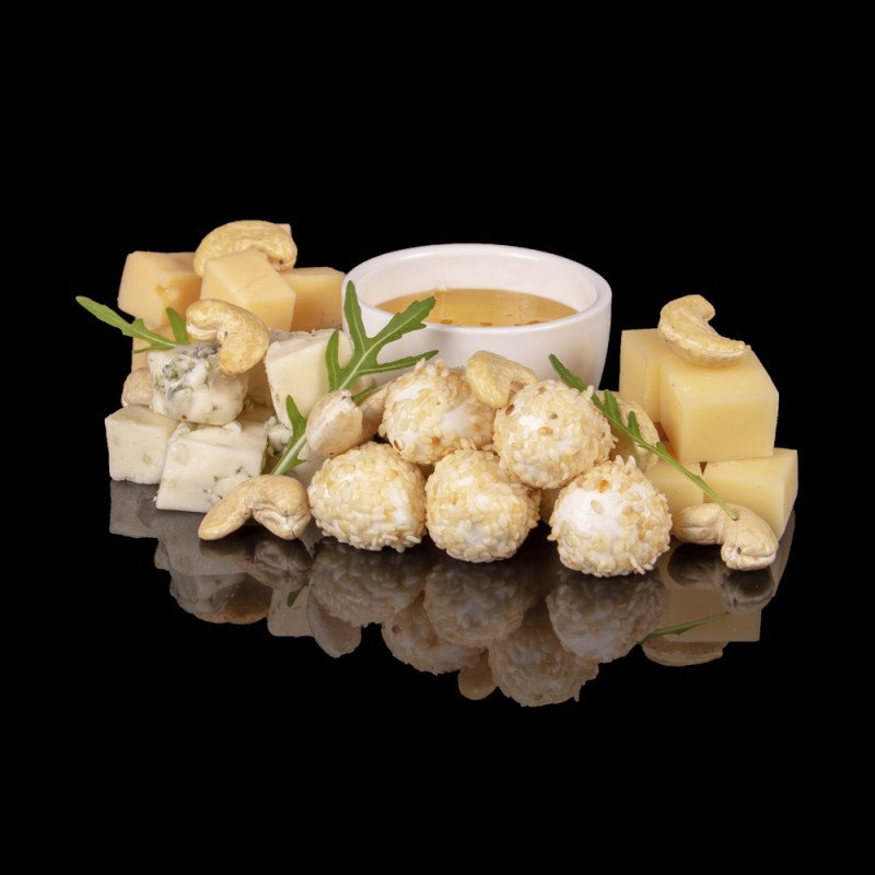 Пармезан, Горгондзола, Маасдам, Моцарелла в кунжуте, мед, орехи кешью.